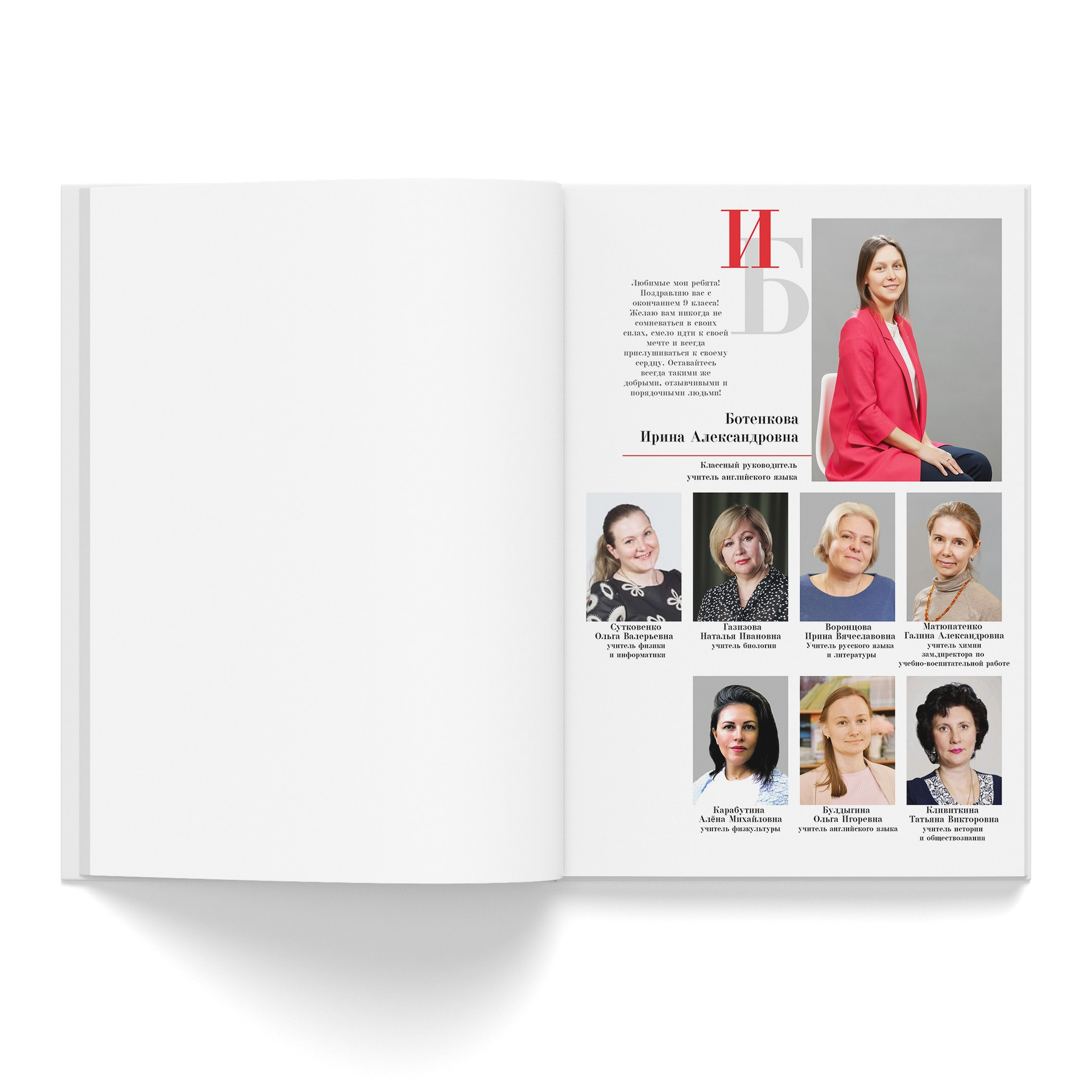 - 2-й разворот — виньетка — портреты всех выпускников с ФИО и классным руководителем