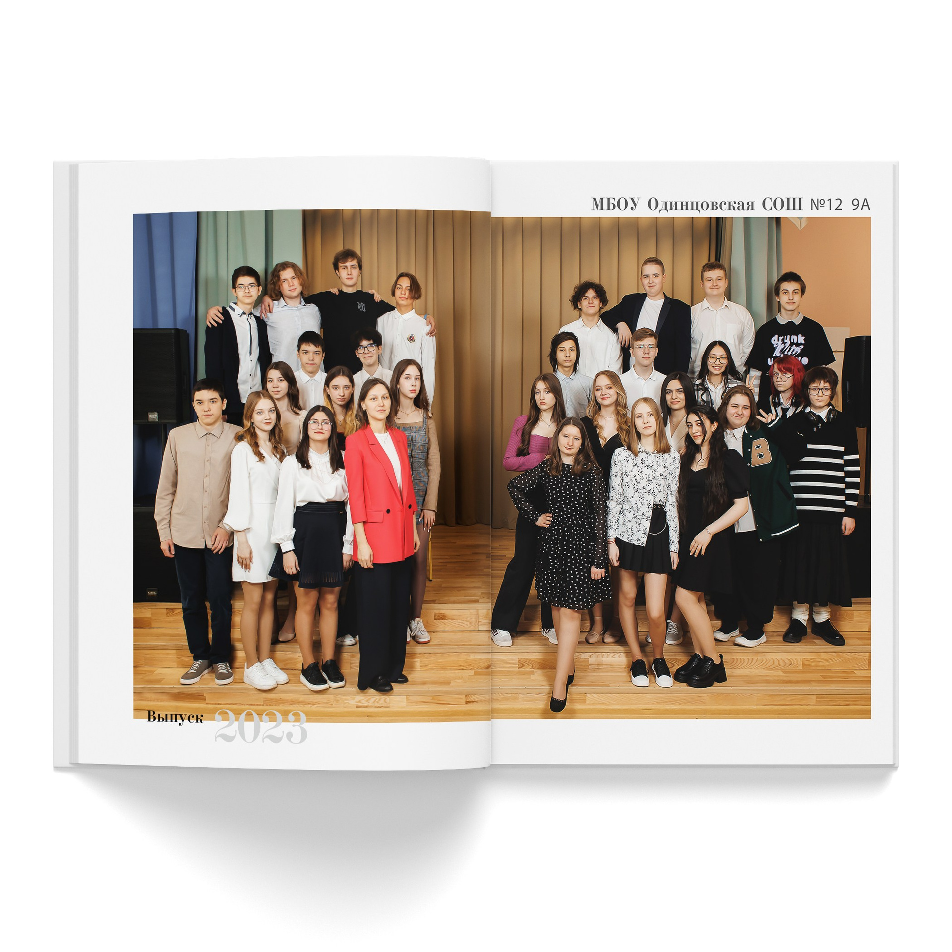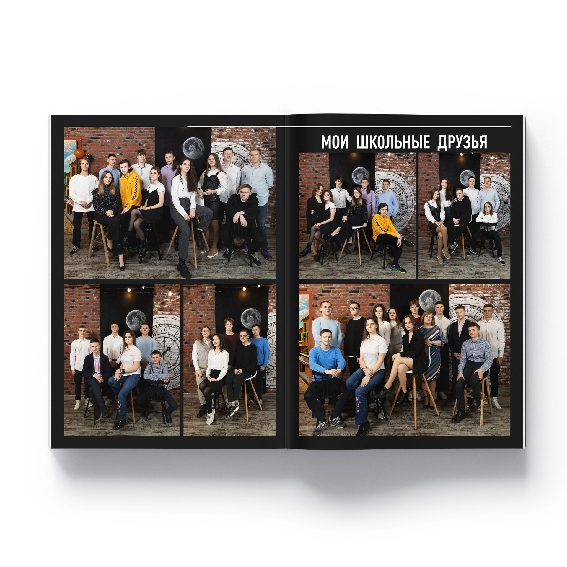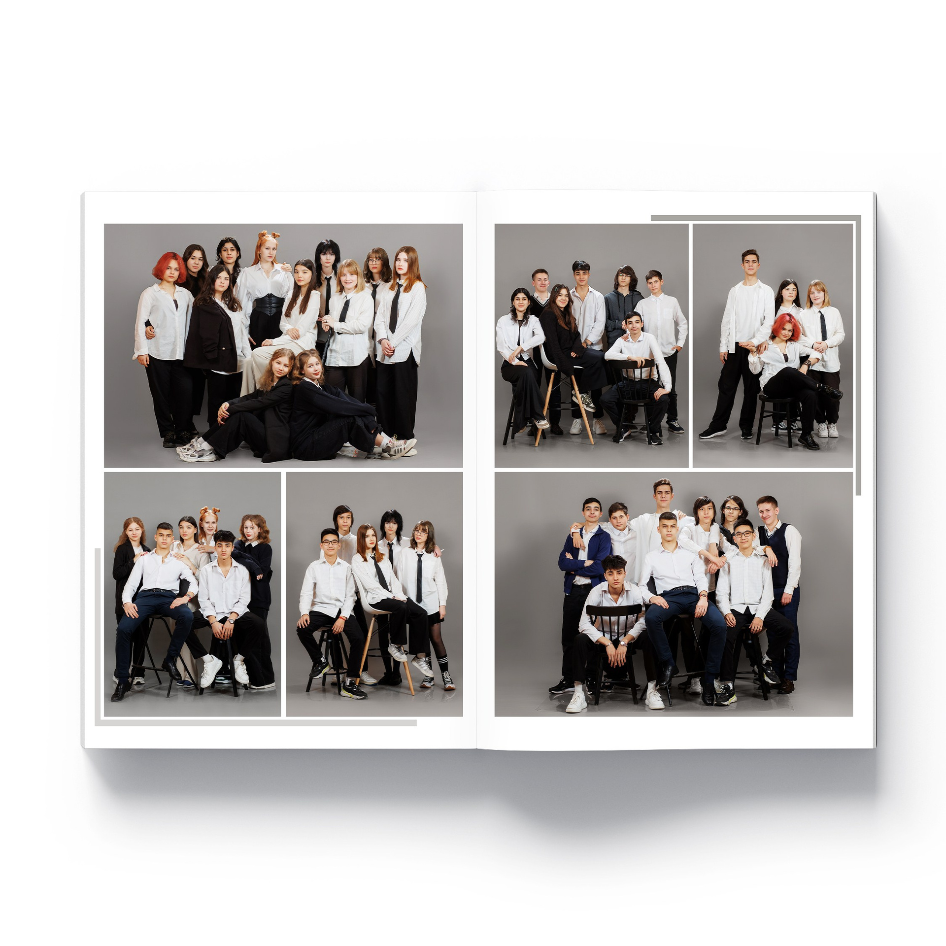 Формат фотокниги А4. Книжная твердая обложка с жесткими разворотами. Альбом индивидуальной верстки для каждого ученика.