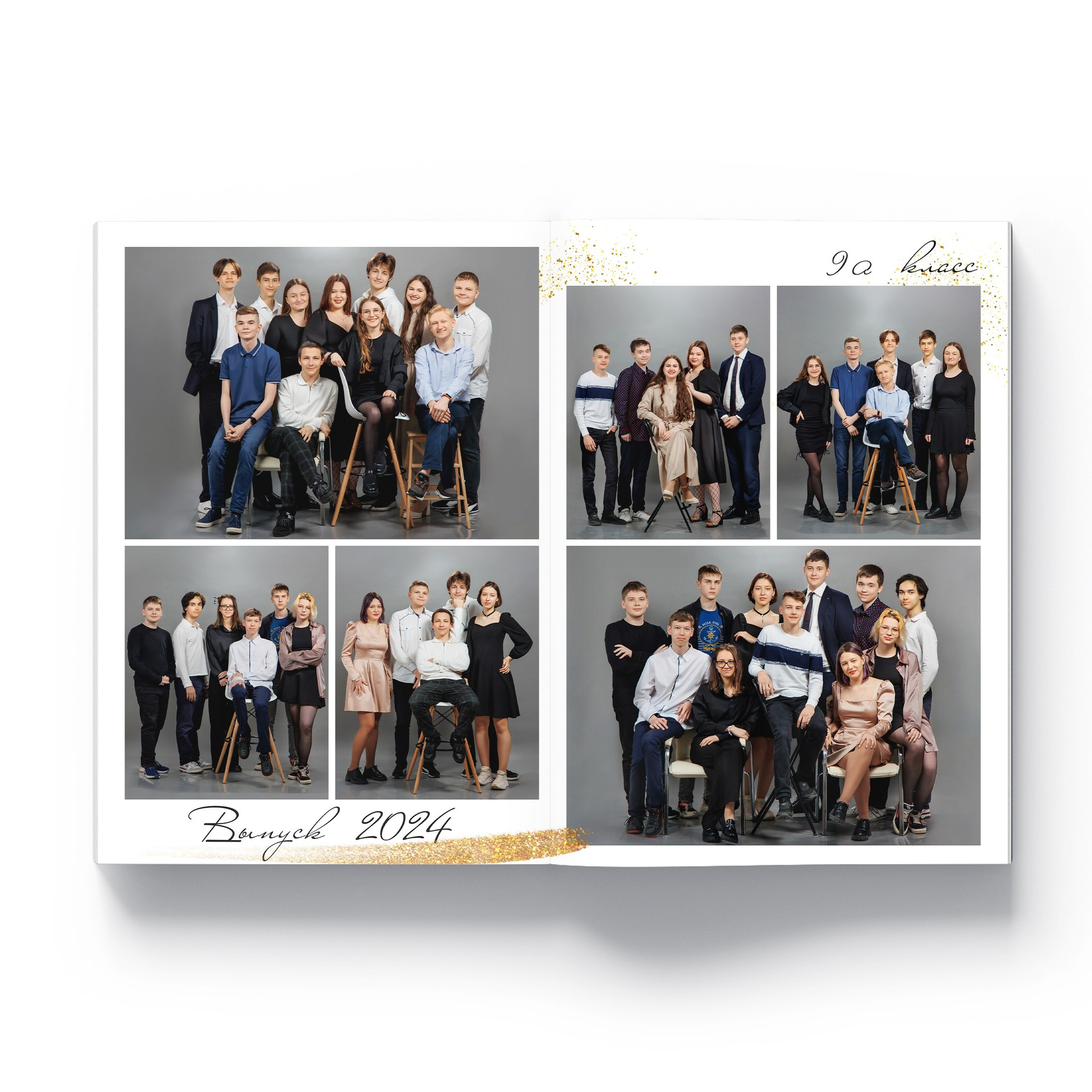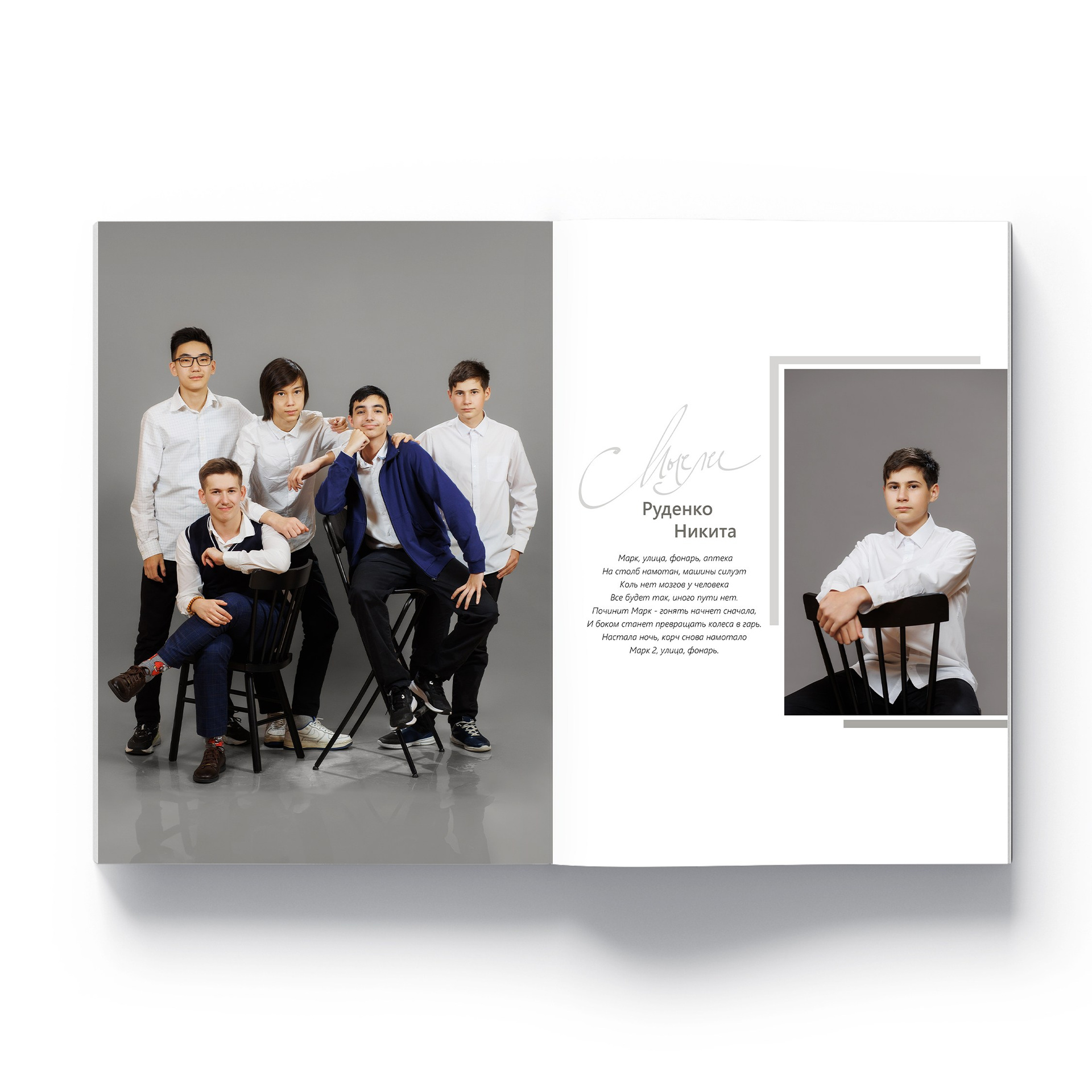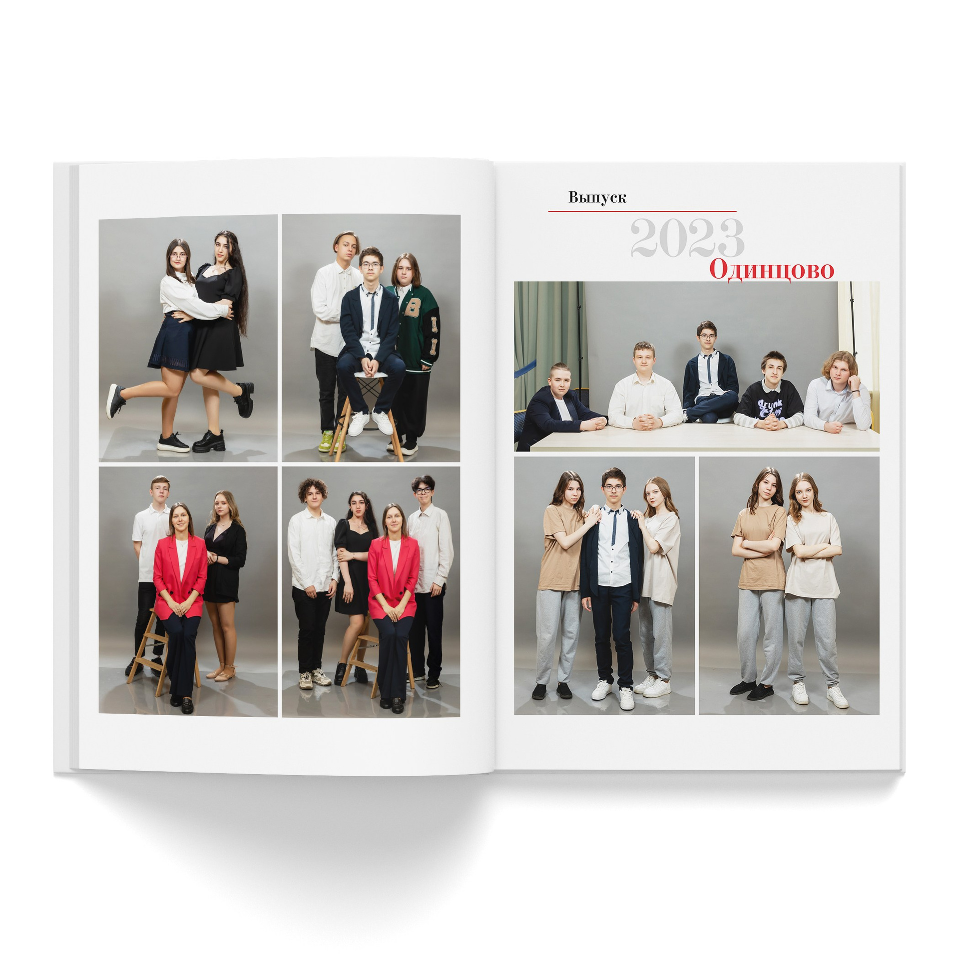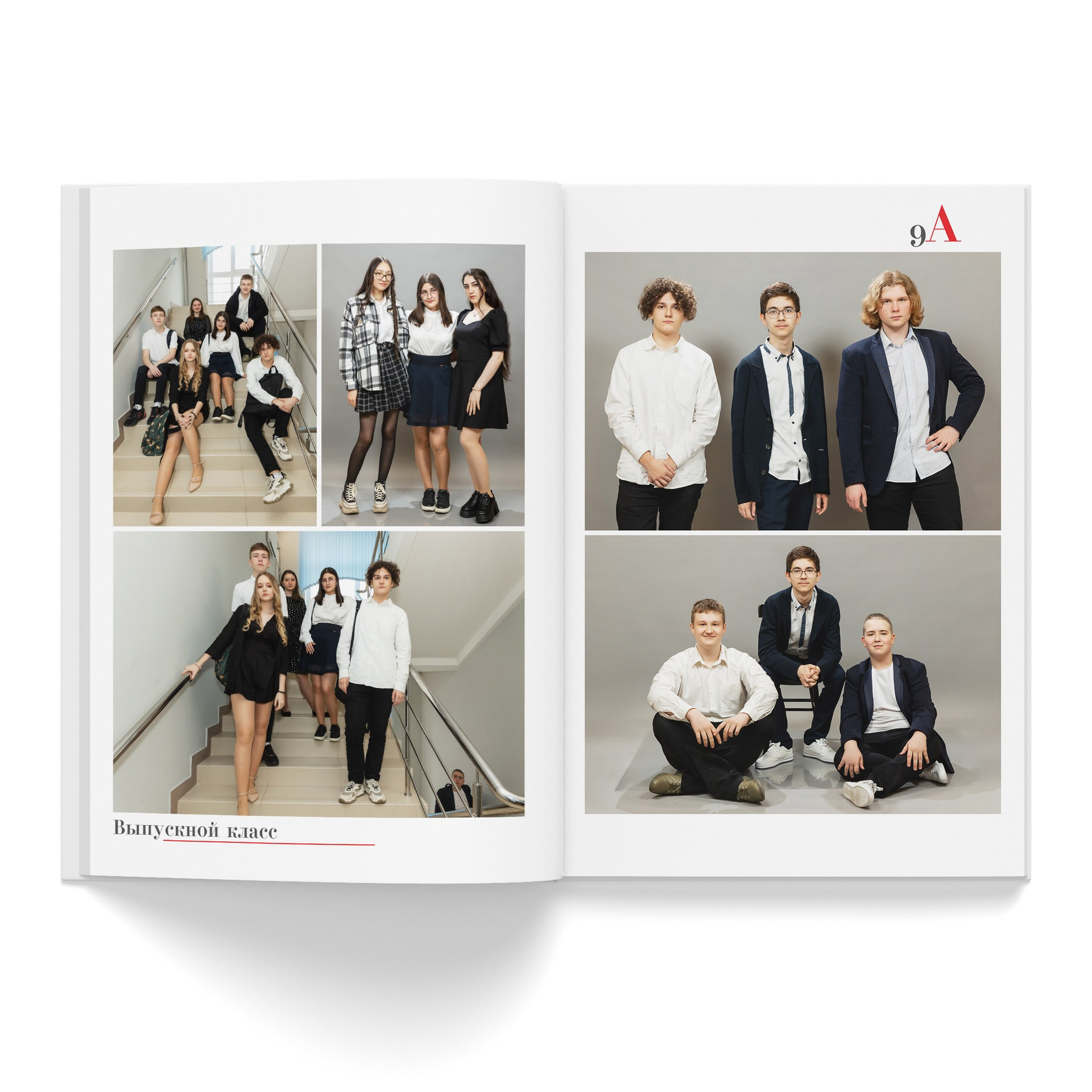 Формат фотокниги А4. Книжная твердая обложка с жесткими разворотами. Альбом индивидуальной верстки для каждого ученика.