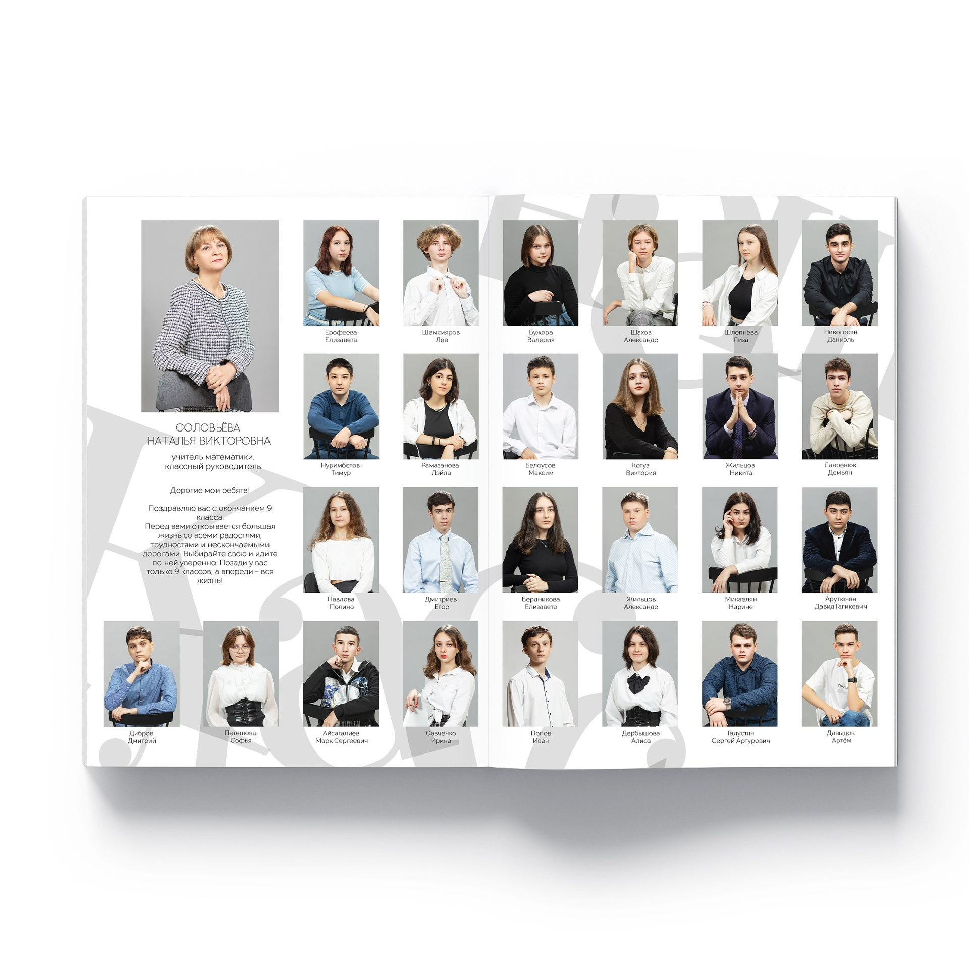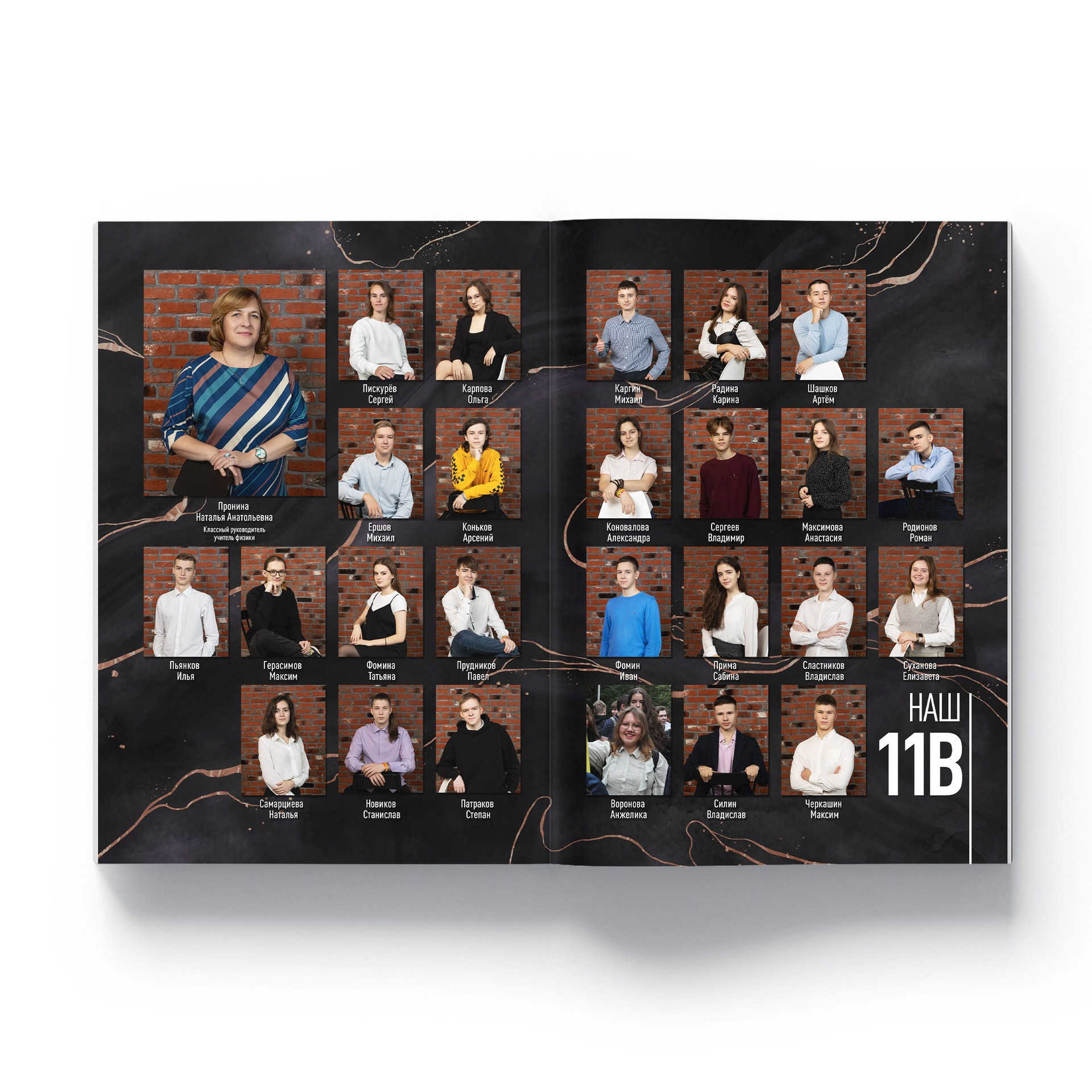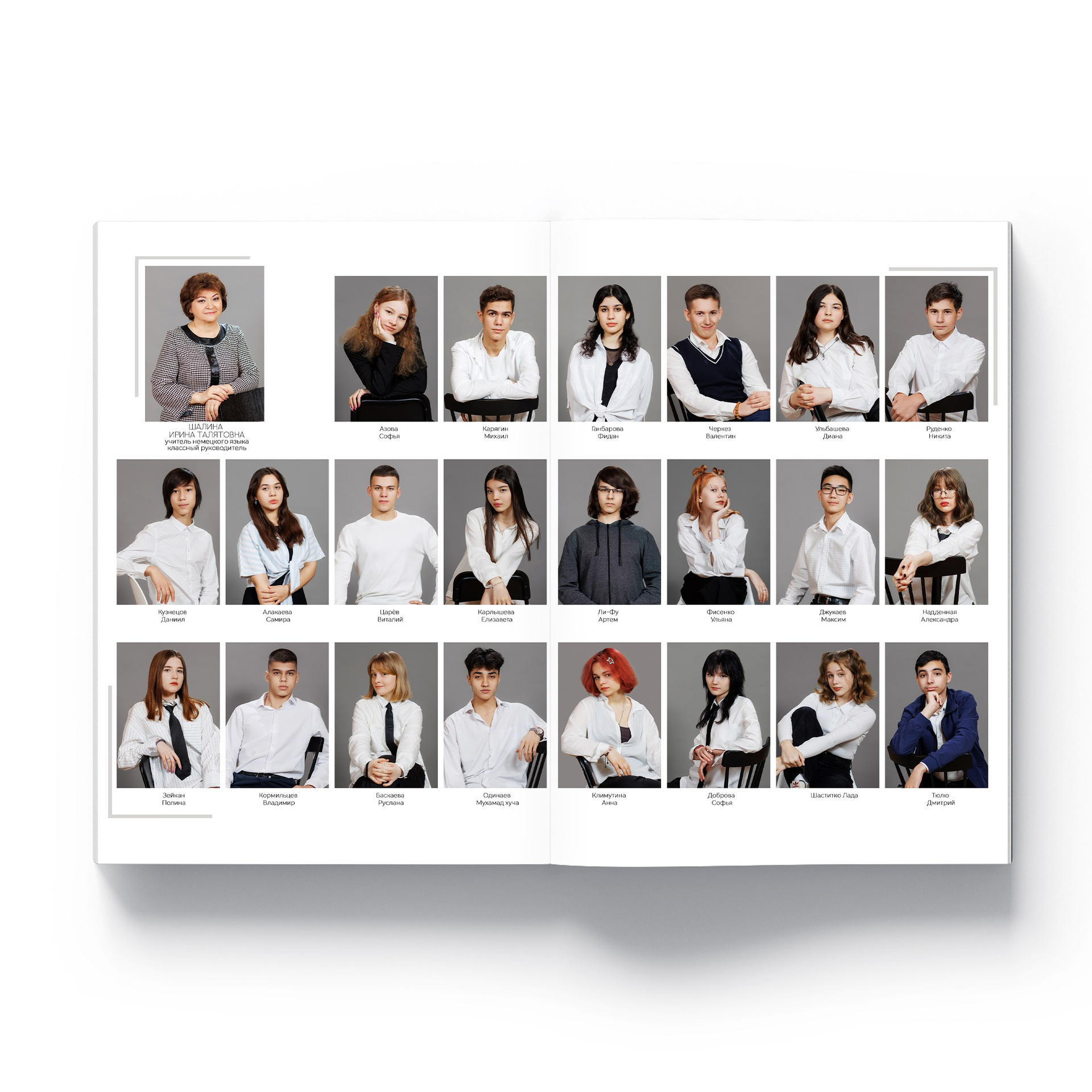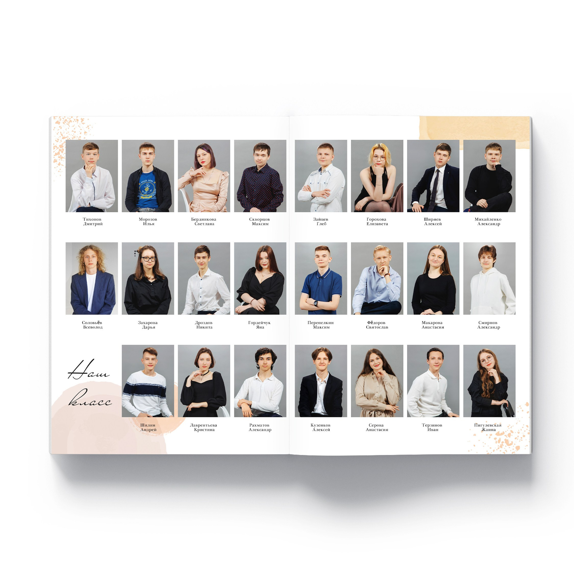 1 разворот — портреты выпускников с ФИО + портрет классного руководителя